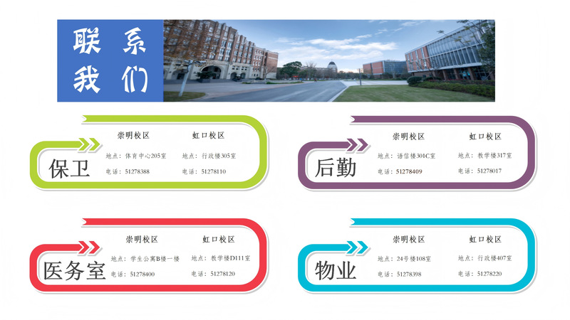 虹口校区:上海市虹口区东体育会路390号 总机:51278000 崇明校区:上海市崇明区东滩大道999号 总机:51278503